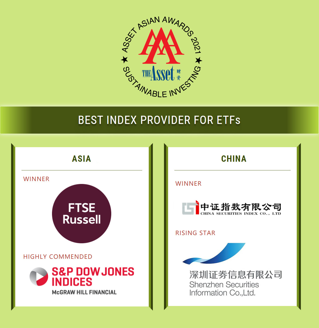 2021年5月7日,公司在財資2021年度可持續投資大獎評審中榮獲“中國最佳指數供應商新星獎”。財資系列獎項是亞洲金融市場(chǎng)頗具影響力的獎項之一,此次獲獎標志著(zhù)公司指數業(yè)務(wù)專(zhuān)業(yè)化能力和國際化水平再上新臺階。